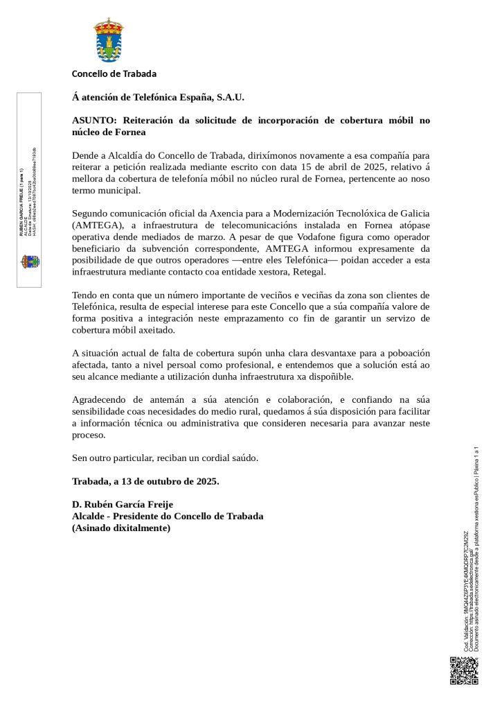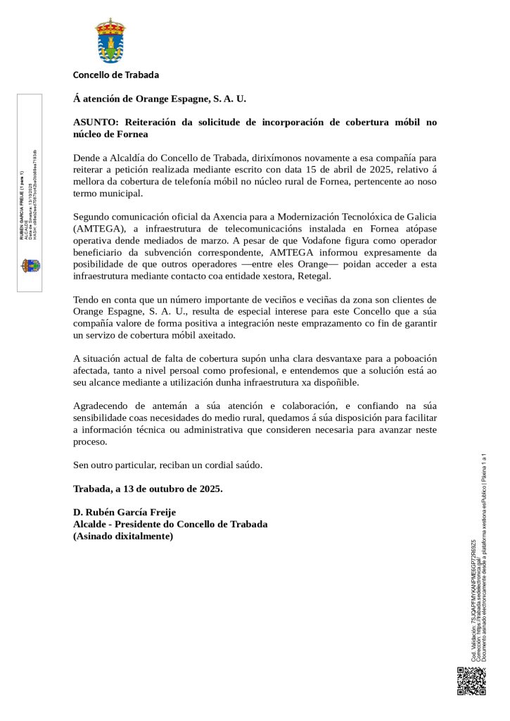 O Concello de Trabada vén de remitir novos escritos á Axencia para a Modernización Tecnolóxica de Galicia (AMTEGA) e ás compañías Telefónica España e Orange, reiterando a petición xa realizada no pasado mes de abril para que se amplíe a cobertura móbil na zona de Fórnea, onde actualmente só opera a rede de Vodafone.